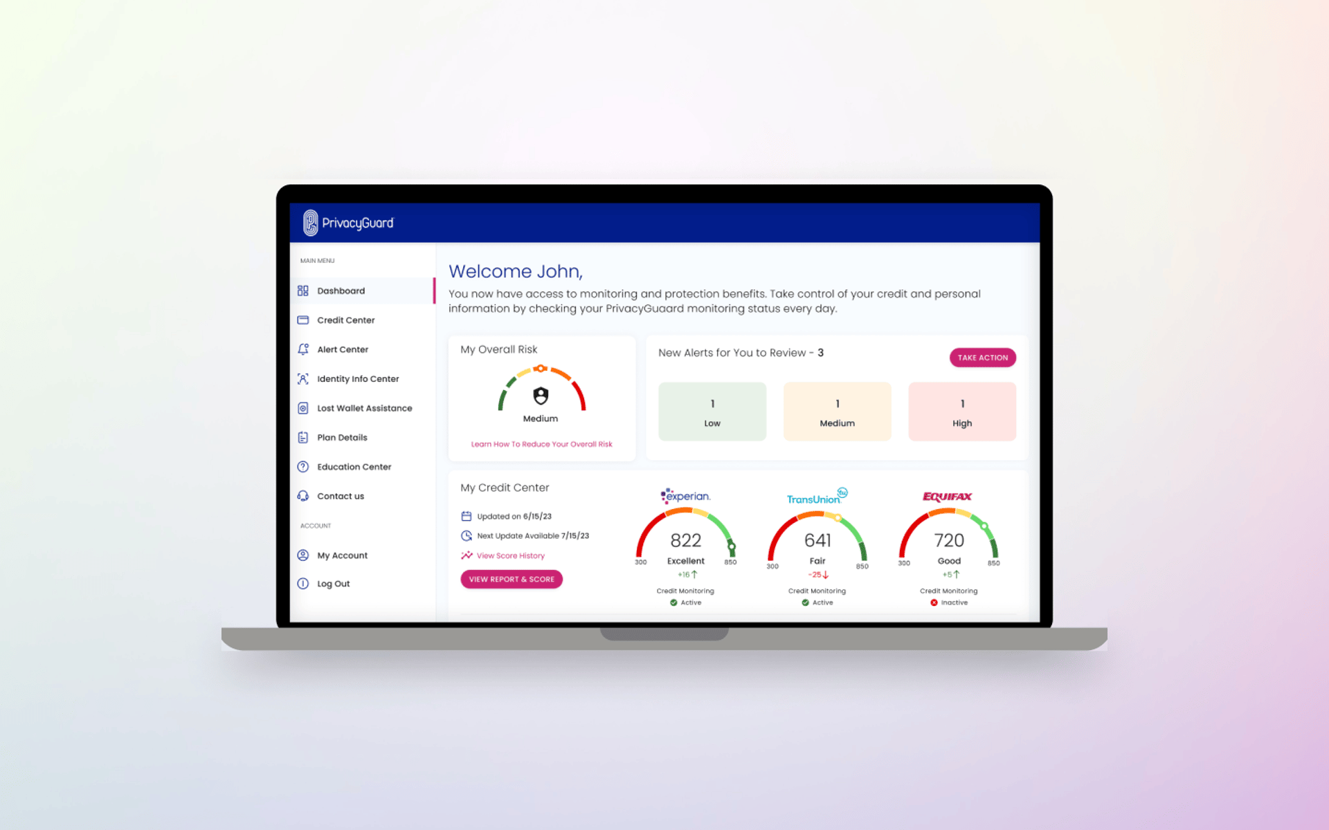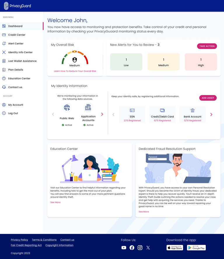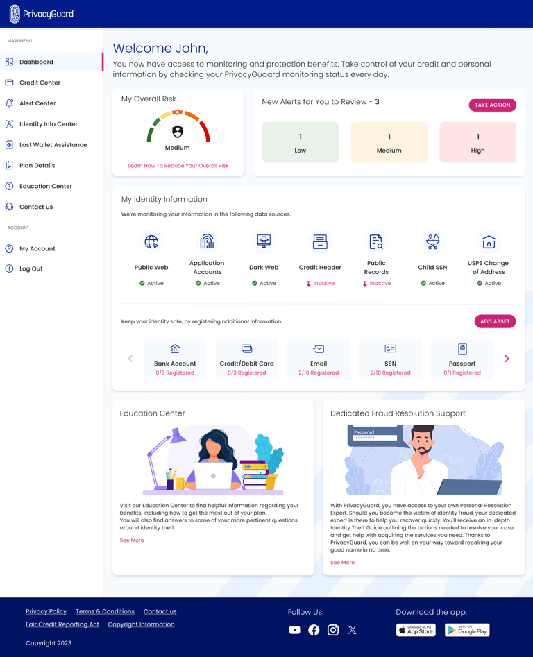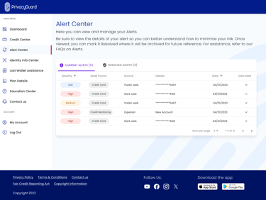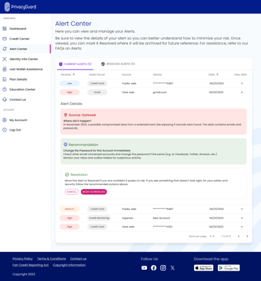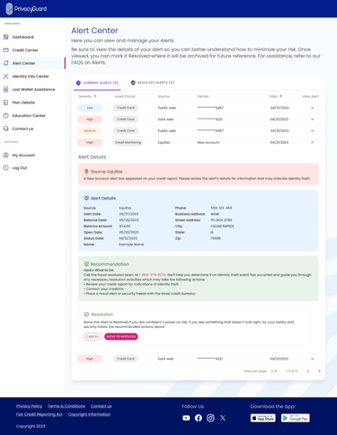 Alerts Center: A revamped alert system categorized identity theft alerts by severity, helping users prioritize responses and take immediate action when needed.