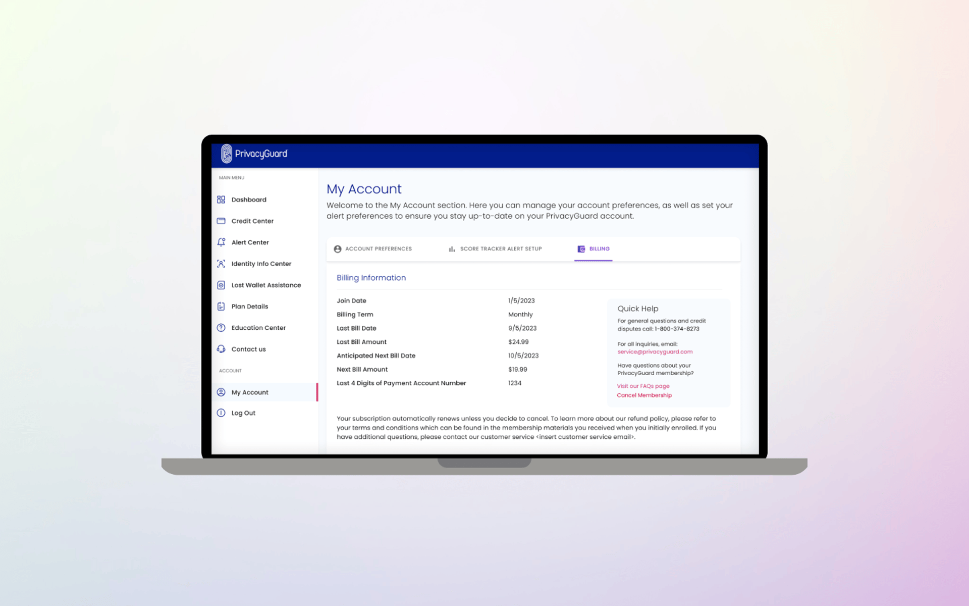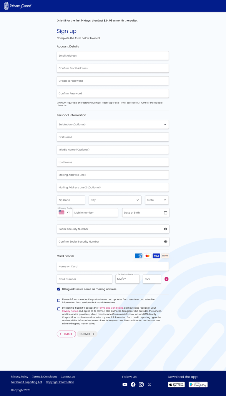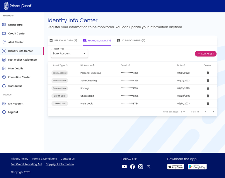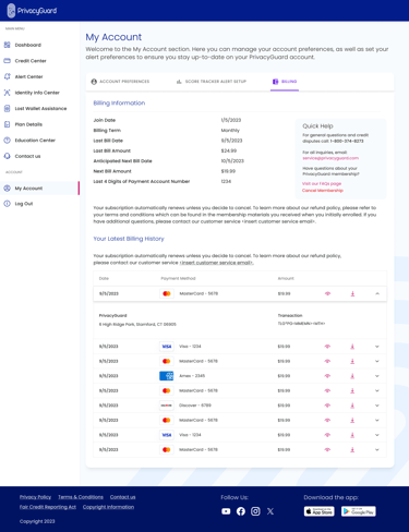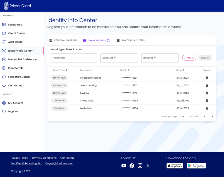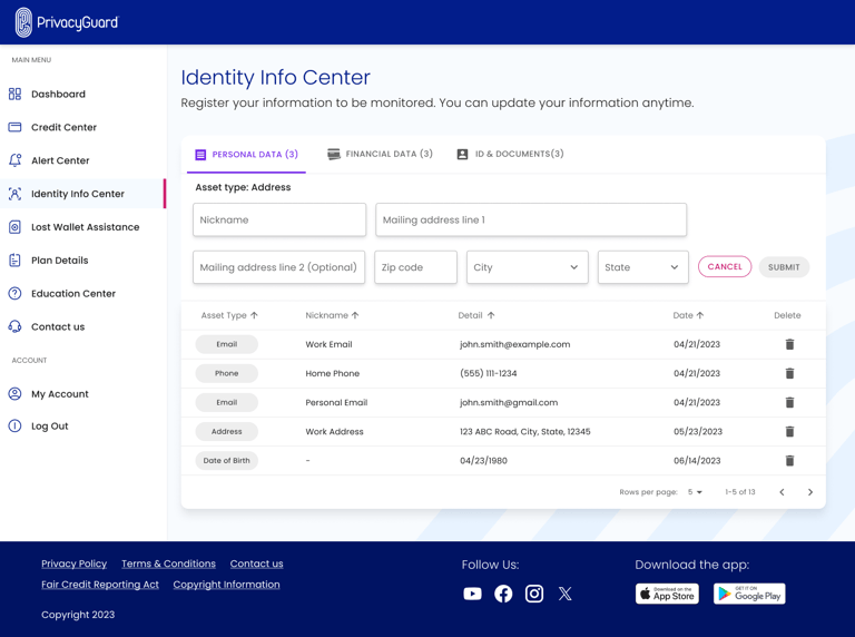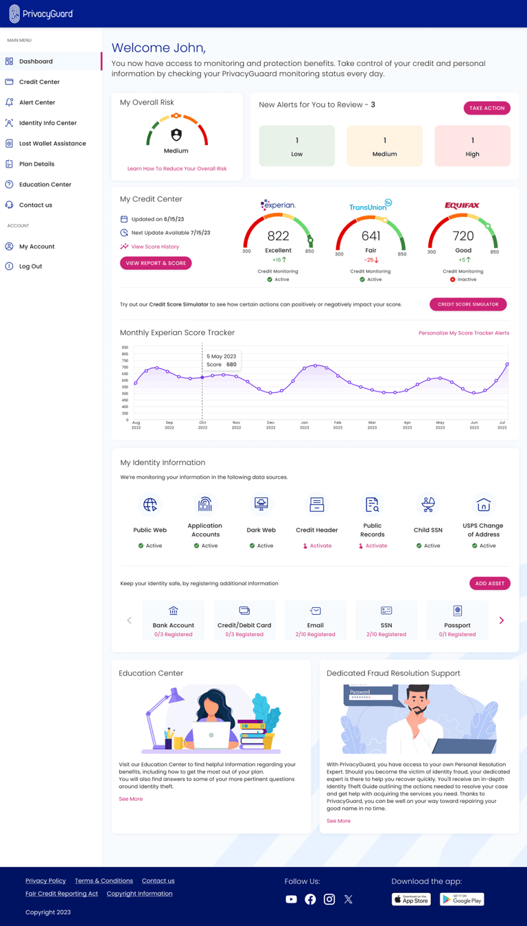 PrivacyGuard is a comprehensive credit monitoring and identity protection service that empowers users to monitor their credit scores and reports from all three major credit bureaus—Experian, Equifax, and TransUnion. The platform also provides robust identity theft protection, enabling users to track and secure sensitive information such as financial accounts, personal data, and government-issued IDs. In addition to monitoring, the service features tools for resolving identity theft incidents and educational resources to help users understand credit and identity protection.