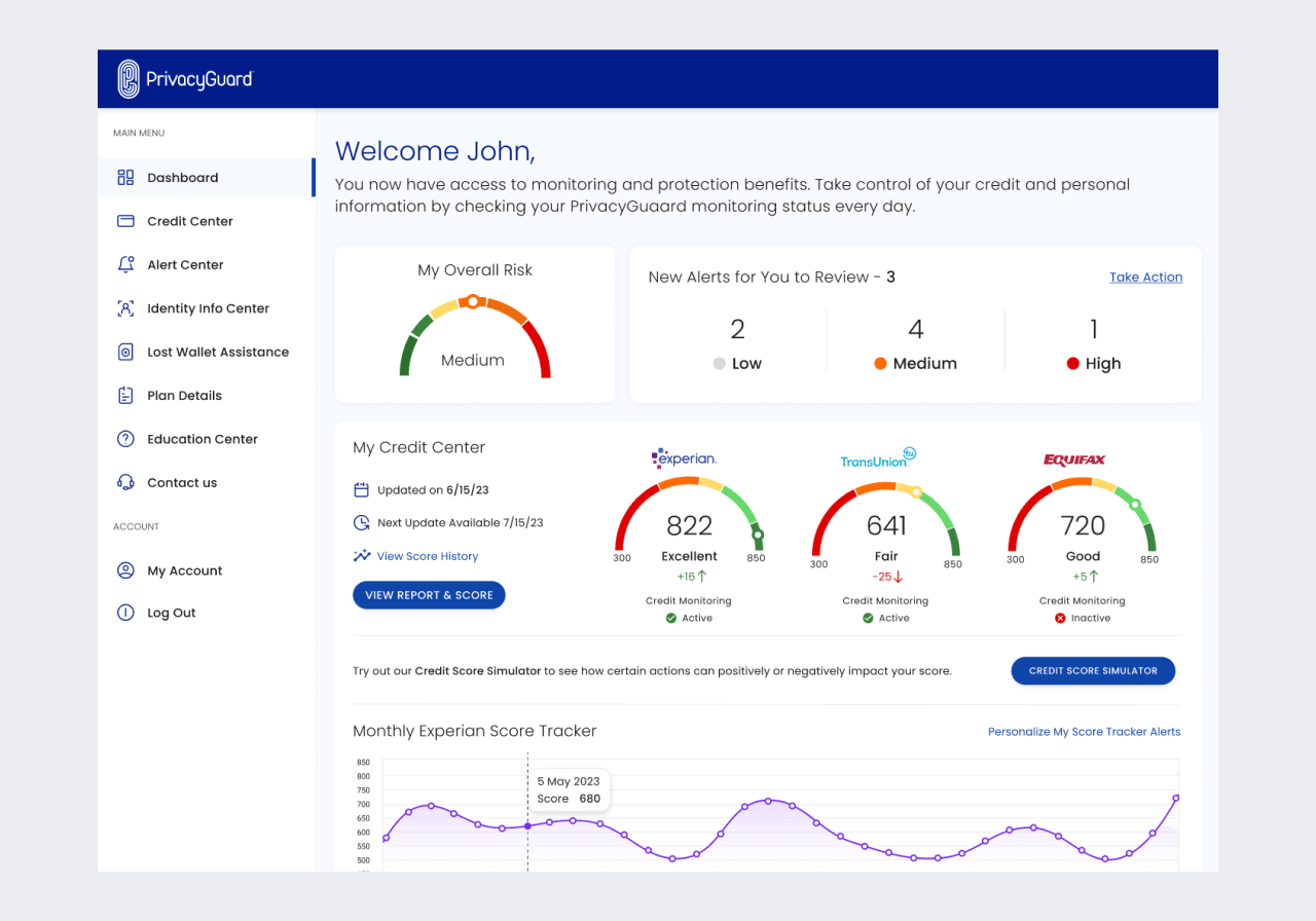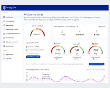 PrivacyGuard is a comprehensive credit monitoring and identity protection service that empowers users to monitor their credit scores and reports from all three major credit bureaus—Experian, Equifax, and TransUnion. The platform also provides robust identity theft protection, enabling users to track and secure sensitive information such as financial accounts, personal data, and government-issued IDs. In addition to monitoring, the service features tools for resolving identity theft incidents and educational resources to help users understand credit and identity protection.